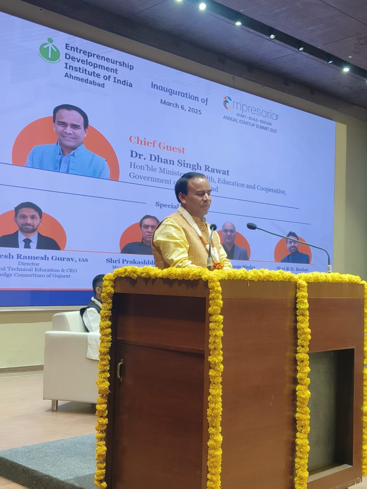 इस अवसर पर संयुक्त सचिव उच्च शिक्षा उत्तराखंड सत्य प्रकाश सिंह, सहायक निदेशक एवं नोडल देवभूमि उद्यमिता योजना डॉ. दीपक पाण्डेय, डॉ. राजेश उपाध्याय, डॉ. मुकेश पाण्डेय उपस्थित रहे। इसके अलावा उच्च शिक्षा व तकनीकी शिक्षा विभाग गुजरात के निदेशक दिनेश गुराव, ज्वादंट कमिश्नर उद्योग आर.डी. बरहट, ईडीआईआई के डॉ. अमित द्विवेदी, डॉ. सत्या आचार्य सहित अन्य अधिकारी उपस्थित